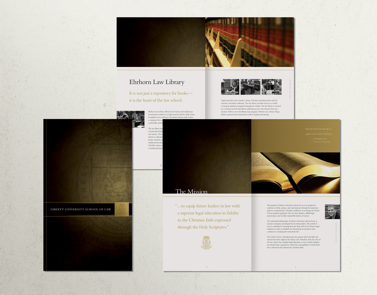 Brochure/viewbook for Liberty University School of Law. Designed while employed at Roark Creative.